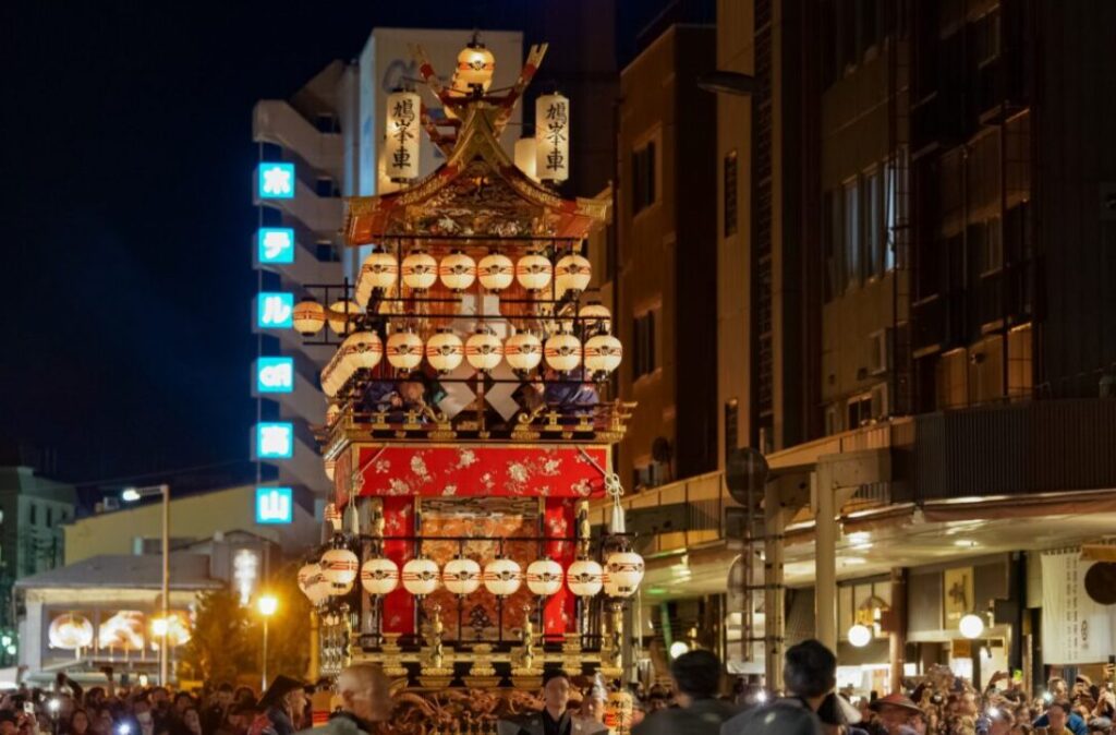 The festival culminates with Yoimatsuri. As night falls, floats illuminated with countless lanterns parade through the streets, casting a magical glow.