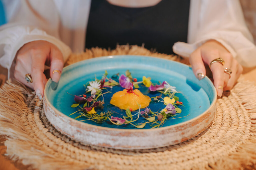 Colorful dishes arranged on a large tray, with the blue sky and sea as the backdrop, create a photogenic and extraordinary experience.